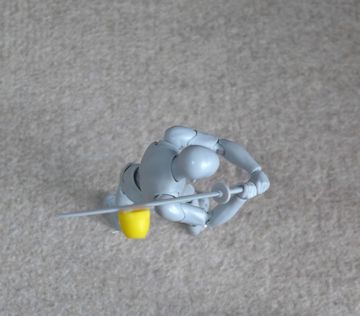 以下で、この刀を持った人型の模型を使って、ゴルフスイングを真上から見た写真を見ながら解説します。刀にクラブヘッド代わりのパーツを付けて、ゴルフクラブに見立てています。